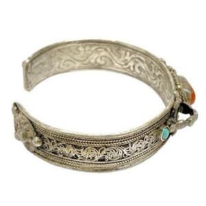VTG Sterling Silver Turquoise Red Coral Cuff Bracelet- Ornate Design Adjustable