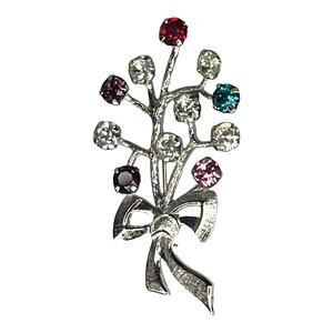 • This beautiful statement colorful brooch crafted of sterling silver features a depiction of a tree/branch, with 11 rhinestone crystals.
