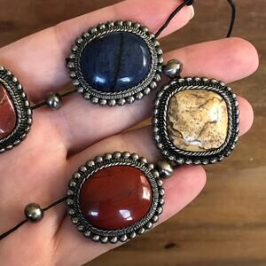 Keywords: cabochon lot, jewelry making supplies, harvest parts, salvage, upcycle, repair, pendant settings, silver tone, boho western, red jasper, picture jasper, blue stone, green stone, sodalite, unakite, chunky bracelet pieces