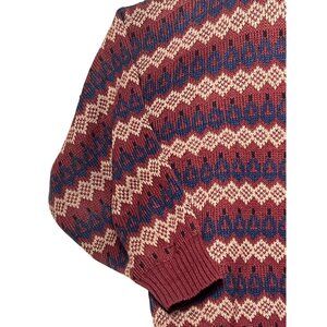 This vintage sweater from Stoneriver Outfitters features a classic maroon and blue pattern from the 80's. Made in Korea from 100% acrylic, this sweater promises comfort and warmth. With a crewneck design and a relaxed fit, it offers a timeless style suitable for a variety of settings.