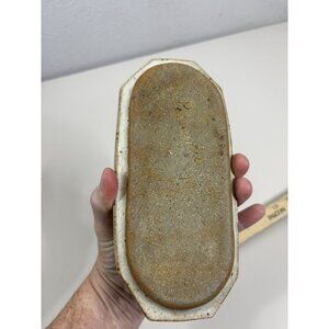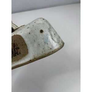 This vintage stoneware butter dish features a unique wheat accent design with a primitive speckled finish, adding a touch of rustic charm to any kitchen. The multicolor stoneware material and the fish-themed details make it a distinctive piece of decorative cookware. Signed by the artist in 1979, this unmarked butter dish is a rare find for collectors of vintage dinnerware. Perfect for serving butter in style, this piece combines functionality with a whimsical aesthetic.