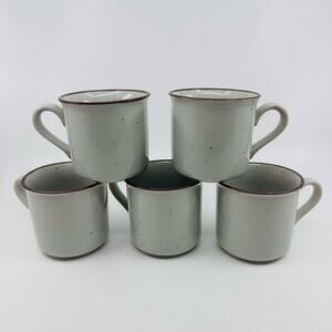 Speckled Stoneware Set of 5 Coffee Mugs & 6 Individual Bakers, Vintage, Round Shape Mugs with Handle, Cream speckled base with Brown Metallic Rims, Drinkware, Serveware, Coffee, Tea, Mug, Cup. Ceramic dish in speckled glaze with brown trim. Reminiscent of the "Brown Mist" pattern designed by Niels Refsgaard for Dansk.