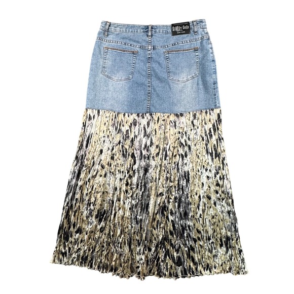 Vintage Street Code New York women's denim maxi skirt featuring a classic blue denim upper paired with a bold animal print pleated hem. Designed with a mid-rise waist and long, flowing silhouette that delivers strong Y2K streetwear energy. The contrast panel construction and pleated bottom create movement and a dramatic statement look, making this skirt a standout archive-style piece. Ideal for Y2K, indie, festival, or eclectic streetwear styling with fitted tops or layered knits.