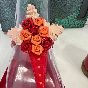 Rare and whimsical, these vintage Stuart Weitzman sandals are a dreamy throwback to late '90s and early 2000s resort style. Crafted in bright cherry red leather, they feature unique floral leather appliqué at the vamp — tiny roses in deep red and orange, accented by blush metallic leaves. The thong-style strap is dotted with orange polka dots for extra charm. The sculpted sole has that classic early 2000s vibe with a wavy rubber tread and cork-like heel insert — comfy and collectible. These are perfect for anyone channeling Y2K nostalgia, boho romanticism, or standout vacation look.