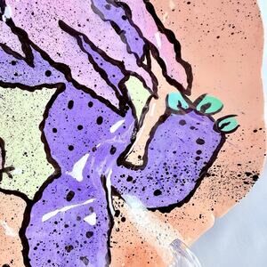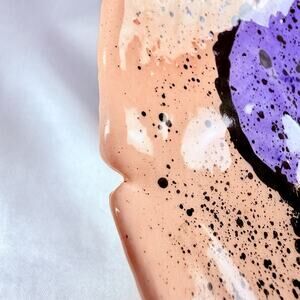 Vibrant large hand-painted ceramic platter/bowl featuring bold one eyed monsters and cactus-inspired abstract design in pink, purple, and yellow with black splatter and outlines. Freeform organic shape typical of 1980s postmodern studio ceramics. Beautiful as a wall display or centerpiece bowl.