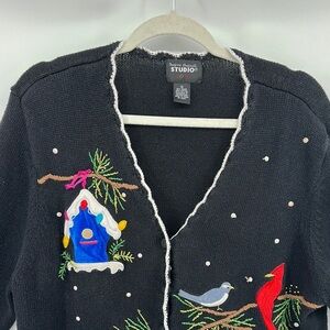 This elegant black cardigan from Studio showcases a delightful festive design featuring vibrant cardinals and evergreen motifs. Crafted with intricate embroidery, it offers a cozy and stylish addition to your winter wardrobe. The scenic patterns on the front add a touch of holiday charm, making it perfect for seasonal gatherings.
