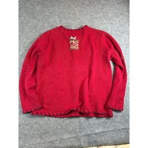 VTG Studio Joy Christmas Cardigan Women M Red Knit Beaded Patchworks Grandma 90s