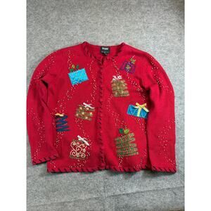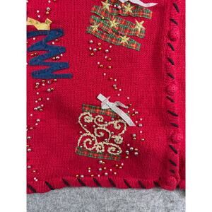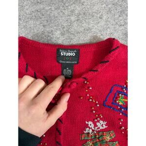 Vintage Studio Joy Christmas Cardigan Womens Medium Red Knit Beaded Patchworks Holiday Presents Grandma 90s