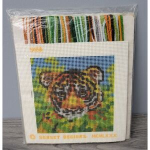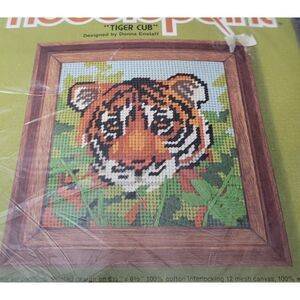 For sale is this VTG 1980 Sunset Designs jiffy needlepoint Tiger Cub Designed by Donna Enstaff #5458 Pure Wool Yarn Printed Design on 6 1/2" x 6 1/2" Canvas Fits Standard 5" x 5" jiffy frame Pre-Owned Unopened. Comes from a Smoke-Free Shop.