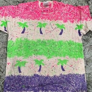 Vintage 1980s Surf Mania Fruit of the Loom SS Neon Pink, Green and Purple Palm Tree Splatter Splatter Paint T-Shirt Size XL