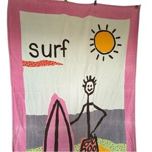 Vibrant beach towel with a surf design. Features a playful stick figure and surfboard. Perfect for beach days.