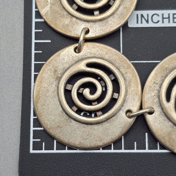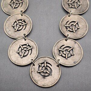 This vintage necklace features a series of swirl and medallion designs, creating a bold statement look. The antique silver tone adds a touch of classic elegance, making it an excellent choice for those seeking a unique piece of jewelry that stands out. The adjustable length ensures a comfortable fit. • Hook clasp closure • Swirl disc design • Antique silver plated • Adjustable chain Features: • Faux Ottoman coin charm featuring Mahmud II’s imperial tughra • Spiritual Neckalce • Geometric Sun • Each Medallion is 1.25" • Ethnic Global Style, Statement Jewelry Size: Womens 16" Condition: Pre-Owned Good Good condition Gently used There may be some scratches due to normal use. Natural patina, light tarnish. Please review all descriptions and photos closely before purchasing, thank you! Smoke Free Workspace Offers are always welcome and bundle to save on shipping. Happy Poshing!