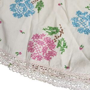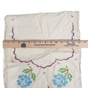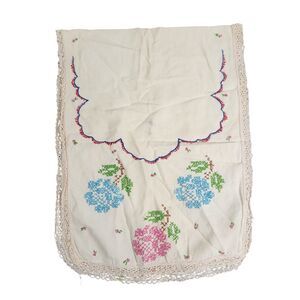 VTG TABLE RUNNER PINK BLUE ROSES FLORAL EMBROIDERED DRESSER SCARF ESTATE MCM