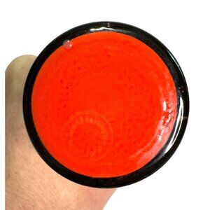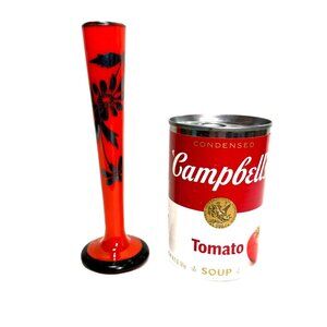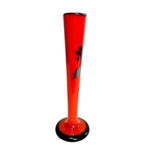 This VTG Orange Tango Bud Vase is an exquisite piece of Art Deco style floral design chez glass from the 1930s. The vase, 6.25" H x 2" W in size, features a vibrant orange and black color palette and is hand painted with meticulous attention to detail.