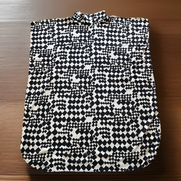 The VTG TAPOO HAWES of California Black White 60'S Retro Muumuu is a vintage women's dress from the 1960s, featuring a black and white geometric pattern with a mock neck style. Made from a polyester blend material, this original Muumuu style dress has an adjustable waist tie for a customized fit. With a chest size of 42 inches and a shoulder to hem length of 52 inches, this retro dress is perfect for a casual occasion and showcases the unique fashion of that era. Made in the United States by TAPOO HAWES of California, this one-size dress is a standout piece for any vintage clothing collection.