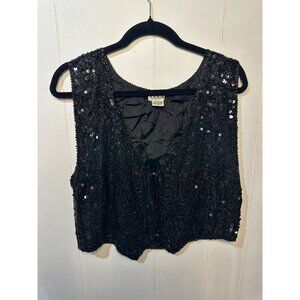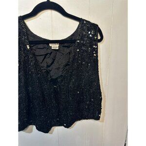 Elegant black sequin and beaded vest, perfect for evening events, parties, or holiday wear. Features a sleeveless cropped design with shimmering detail. Women’s size small, measures 15.5" pit to pit and 18" length.
