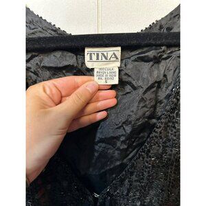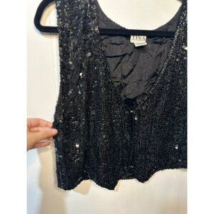 VTG TINA Black Sequin Beaded Vest Women Small 15.5"x18" Silk Cropped Evening