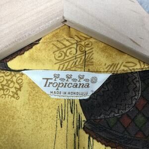 This vintage Tropicana Hawaii shirt camp features a gold Hawaiian tribal pattern. Made of woven cotton fabric, this shirt features a loop collared neckline and short sleeves with button closure.