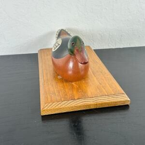 VTG Table Decor Duck Decoy- Painted Wood- mounted on wood- mallard- 10x6”