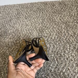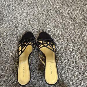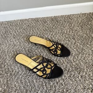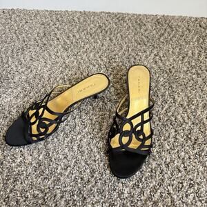 VTG Tahari Kitten Heel Strappy Sandals Womens 9.5 M Black Satin 90s Y2K Slip On