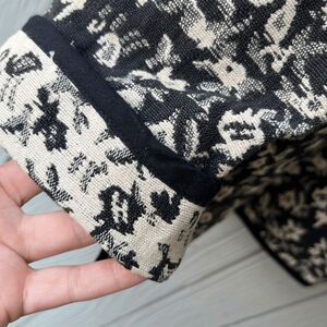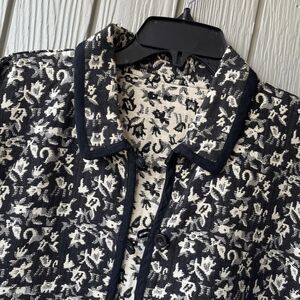 Vintage Take Two Reversible 100% Cotton Jacquard Jacket, made in India. Features a double-sided design in contrasting black and cream floral patterns, with a subtle texture and a relaxed, boxy silhouette. Fully reversible with button-and-loop closures on both sides and neatly piped edges for a refined finish.