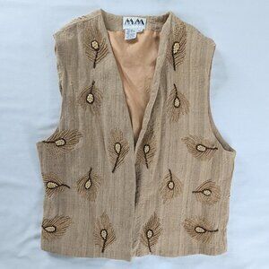 VTG Tan Beaded Silk Open Front Woven Leaf Design Vest