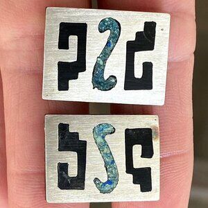 Mid-century black Onyx sterling silver cuff links from Taxco Mexico circa 1950s with modern Aztec design & Crushed blue stone chips accent.