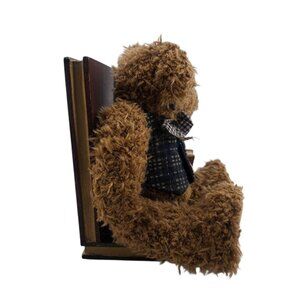 Add a touch of nostalgic charm to your space with this pair of vintage plush teddy bear bookends. Featuring an adorable boy and girl bear duo, each is seated on a painted wooden “book” base. The girl bear wears a striped blouse with lace trim, burgundy checkered pinafore, matching bow, and holds a red apple, while the boy bear wears a navy plaid vest, bow tie, gold-tone wire glasses, and holds a small book titled “Teddy’s Stories.”