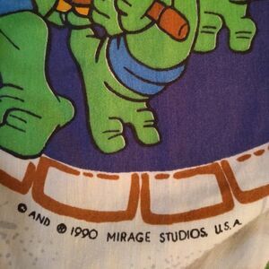 Vintage Teenage Mutant Ninja Turtles Pattern Bed Sheet, Made in USA, Mirage Studios, 1990 - Measures 48" x 96" - Two Small Stains (Pictured)