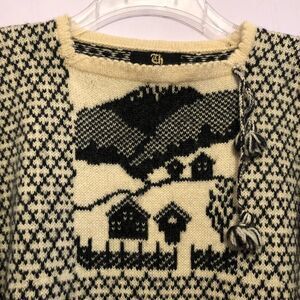 Step into a world of timeless style with this authentic vintage Telemark wool sweater. A true statement piece, this pullover showcases traditional Norwegian folk art with its iconic knitted motif of charming houses and a serene mountain landscape. The tight-knit, chunky wool construction is perfect for the cold weather seasons, offering both warmth and a cozy, heirloom feel.