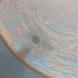 Thomas Bavaria porcelain is known for having delicate looks & "softer" in color. This plate is no exception for having these tendencies. The light, soft colors on the inside of the plate is similar to the inside of a seashell. This 'pearly sheen' is called "lusterware". The plate also has a thick, gilded trim which appears to be hand painted since there are inconsistencies to the gilded shapes that were painted on.