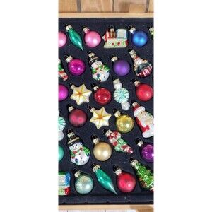 The Vintage Thomas Pacconi Mini Christmas Ornaments are a set of 48 glass mercury ornaments from 2003, housed in a wooden box. These small multicolor ornaments are novelty themed and hand-blown glass, featuring a classicism style perfect for Christmas decor. Made in China, this original collection of ornaments by Thomas Pacconi adds a touch of vintage charm to any holiday display.