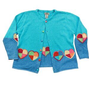 vintage cardigan, women's sweater, blue cardigan, heart print sweater, Timberlea clothing, colorful button top, cozy knitwear, casual layering, XL women's cardigan, unique heart design, soft cotton blend, retro sweater, long sleeve knit, romantic
