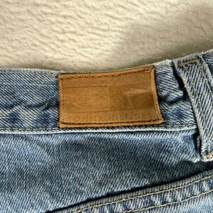 The product is a pair of vintage Tommy Hilfiger women's jeans in a light wash with a mid rise and classic fit, featuring a bootcut style. These jeans are made of 100% cotton denim and are machine washable. They have a solid blue color and a 5-pocket design with a zip and button closure. The size is 10, waist size is 31 inches, and inseam is 28 inches. This retro-themed pair of jeans offers a comfortable and stylish option for any season, whether it's winter, summer, fall, or spring.