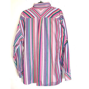 Previously Owned Vintage Tommy Hilfiger Cotton button down shirt. Long sleeves. Multicolor rainbow striped shirt. Tag says 80's 2-ply fabric.