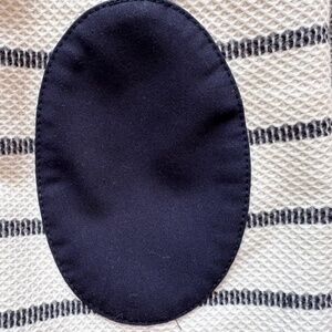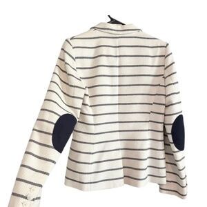 Tommy Hilfiger womens blazer size 10, featuring a cream base with navy-blue stripes and elbow patches. The V-neck collar and long sleeves give it a classic, nautical old money look.