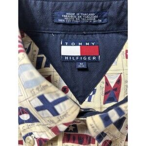 This vintage Tommy Hilfiger shirt for men in size M features a yellow color with sailing flag embroidery. It has long sleeves, a collared neckline with button closure, and an oversized fit. Made of cotton with a woven fabric type, this button-down shirt also includes pockets. Ideal for a casual occasion, it showcases a geometric pattern and carries a theme of flags, perfect for a summer, fall, or spring wardrobe. Made in Thailand.