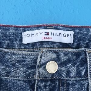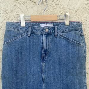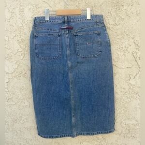 High-waisted 90s Tommy Hilfiger jeans denim skirt. Logos on back. Pockets. Center slit. Vintage size 8, fits like a US 6