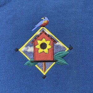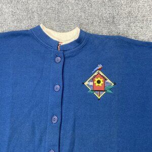 VTG Top Stitch by Morning Sun Sweatshirt Womens L Blue Button Up Bird Birdhouse