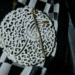 Beautiful detailed piece with swirl and the pattern that most resembles lace. Marked. Domed shape.