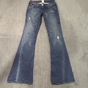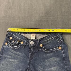 The VTG True Religion JOEY SUPER T Big Stitch jeans in size 25 are a vintage pair of women's jeans from the popular brand True Religion. These regular-sized jeans feature a flared style, a 25-inch waist size, and come in a classic blue color. The True Religion Joey Super T model offers a stylish and comfortable fit for women looking to add a touch of vintage flair to their wardrobe.