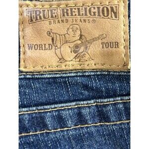 The VTG True Religion Joey Big T Women's Flared Legs Denim in Blue Sz 29 is a rare vintage pair of jeans that exudes a classic American style. Made in the USA with a blend of cotton and elastane, these low-rise jeans feature a flared leg design that is both flattering and comfortable. The denim fabric is a dark wash with logo and button accents, making them a versatile piece for any season. With a zip and button closure, 5-pocket design, and belt loops, these jeans are a timeless addition to any wardrobe for the fashion-forward woman.