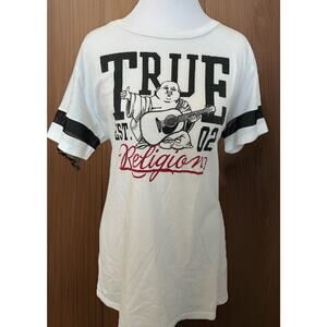 The product is a rare vintage True Religion Women's Buddha XL shirt from their world tour collection. The shirt features a solid white color with a crew neck and short sleeves, made of cotton canvas fabric. It has a pullover closure and a slimming fit, perfect for adding a touch of style to your wardrobe. The design includes a unique logo accent, making it a standout piece for any casual outfit.