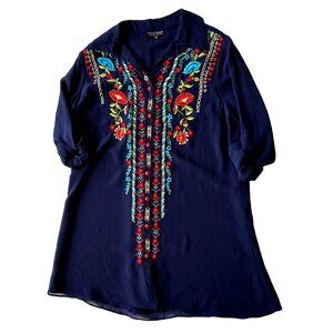 VTB Tunique Tunic Top Medium Navy Floral Embroidery Roll Tab Sleeve Front Button EUC
