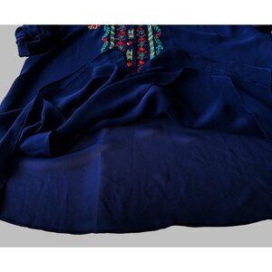 Navy blue background with beautiful, colorful & vibrant embroidered floral designs on front...all intact