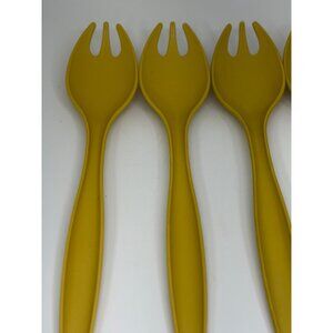 Classic 1970s Tupperware salad serving utensil set in harvest gold, featuring durable fork and spoon “sporks” perfect for vintage kitchen collections.
