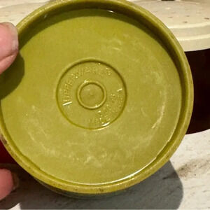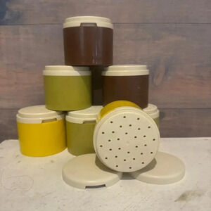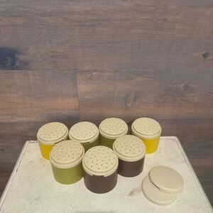 Set of seven vintage Tupperware stacking spice jars in harvest colors green yellow and brown. These jars have shaker lids. Also included are two closed lids. All are stackable.