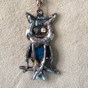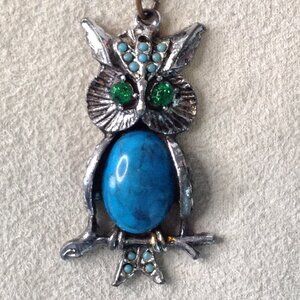 VTG Turquoise Owl Embellished necklace; hippie vibes, Boho, 1960's Cool, Groovy. Owls are for Good Luck, This piece has rhinestones, pieces of Turquoise and other stones. Length: 24", Owl Width: 1x2", VERY Gently Pre-loved.