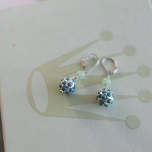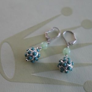 Drop earrings with silver "wrecking balls" decorated with turquoise beads. Lone seafoam green beads above, all attached to a lever back closure.