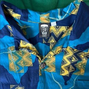 VTG Tutuvi Mens aloha Hawaiian shirt. Size 3X. Teal/Gold Kalo print. P2P is approx 30” / L 31”. Front pocket. No known flaws. (Not Sig Zane, local Hawaii designer)
